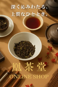幾年もの年月が経っても色褪せることない感動と余韻を残す一杯のお茶。一人の日本人が異国で評茶師の道を歩むきっかけになったそのお茶は大陸にありました。現地で学びそしてお茶を作り、出会った人々と同じ空気を吸いその土地の物を共に食す。そこには国境を超えた絆で囲んだ極上のお茶と、疲れた時にはいつもそっと差し出される東洋の知恵が詰まった養生茶がありました。喉を潤すお茶ではなく、まさに『嗜む』にふさわしい選び抜かれた最上級の茶葉で客人をもてなし、一杯を追求する大陸の茶藝館文化。この感動を自国にも届けたい…。凰茶堂はそんな想いからはじまった中国茶・台湾茶、薬膳養生茶専門店です。プロ育成のための中国茶・台湾茶講座を主とし、日本人評茶師ならではの視点で厳選した安心、安全のこだわりリーフティをお楽しみいただける茶文化体験型茶房や茶葉の販売スペースもございます。(茶房のオープン日は営業日カレンダーをご参照下さい)