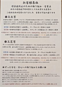 再開にあたりまして今後の安全安心への取り組みの一貫として工夫茶と工芸茶のご提供方法を変更させていただく事になりました変更は以下の通りです↓