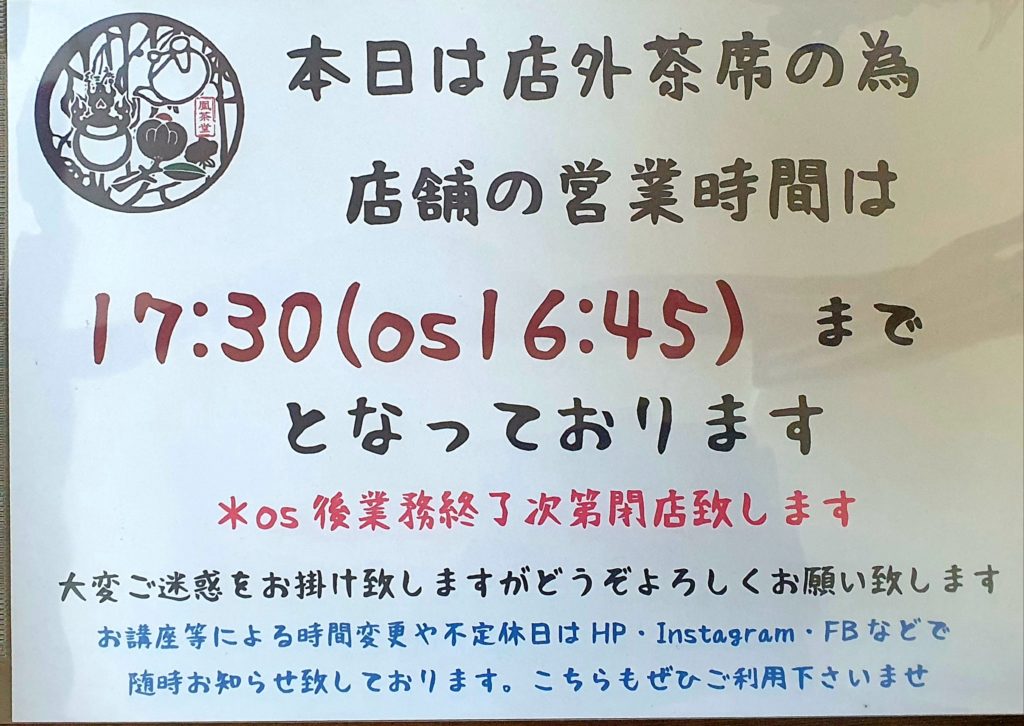 店外茶席による営業時間変更のお知らせです