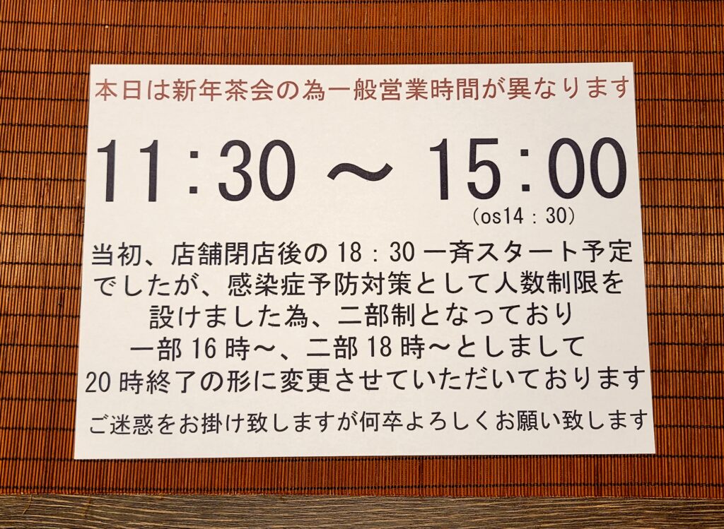 1月30日(日)新年茶会の人数制限による2部制と時間繰上げの為、一般営業時間15時まで