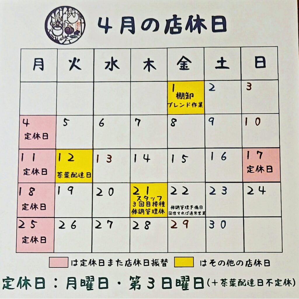 早速ですが4月の店休日です