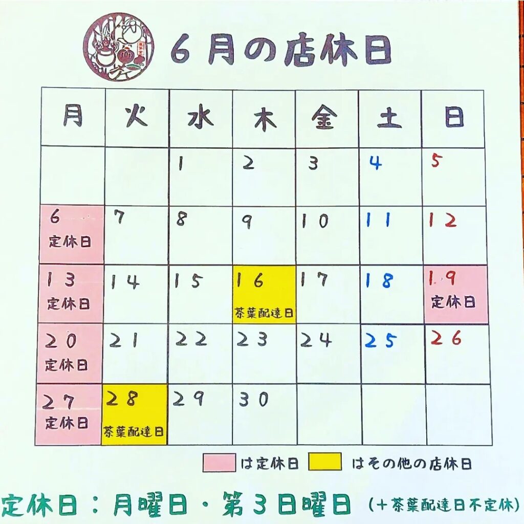 早速ですが今月の店休日のご案内です🍀