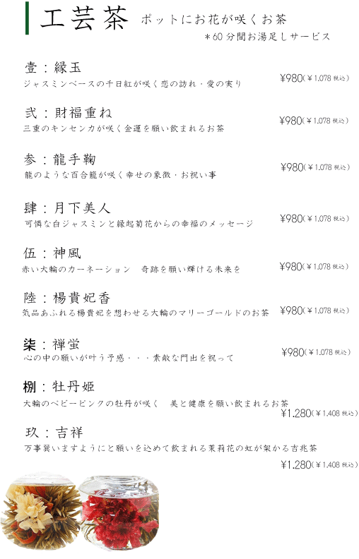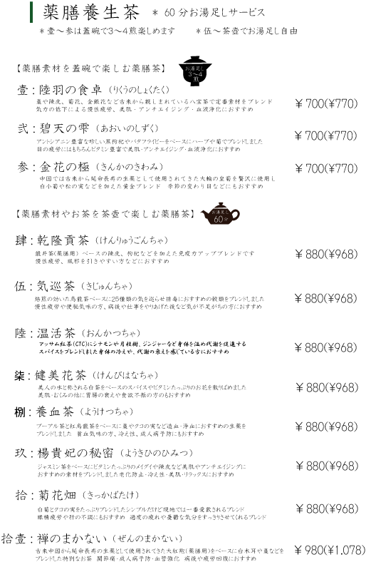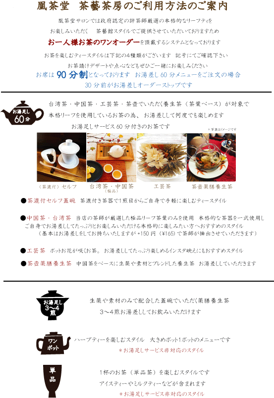 当店は大陸の「茶藝館文化体験茶房」となりまして、茶師厳選のプレミアムリーフや薬膳茶をゆっくりとお楽しみいただくことを目的としました茶房となります為
