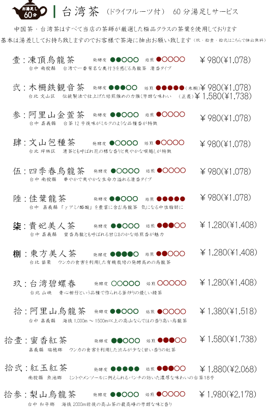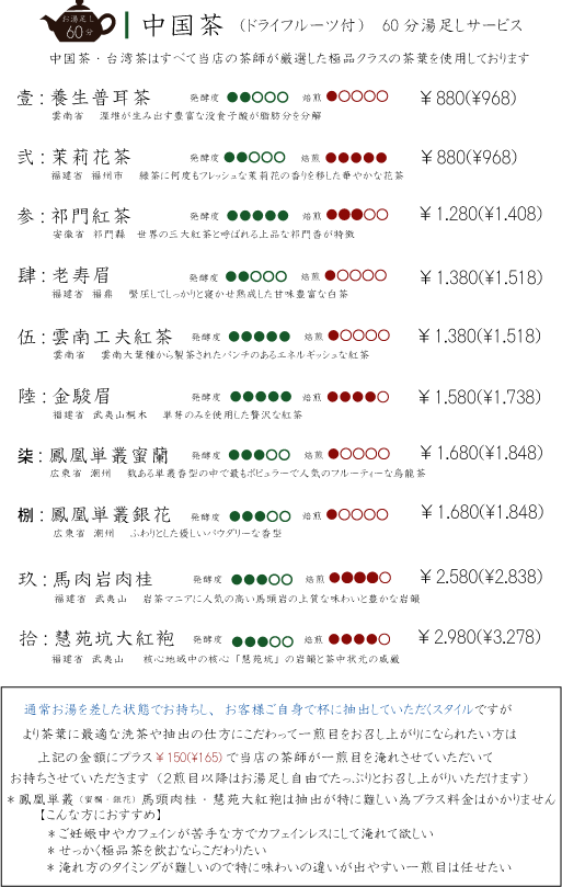 当店は中国茶、台湾茶専門店ならではの本格的なリーフティーで提供させていただく関係上テーブルに熱湯ポットを置かせていただく事ため