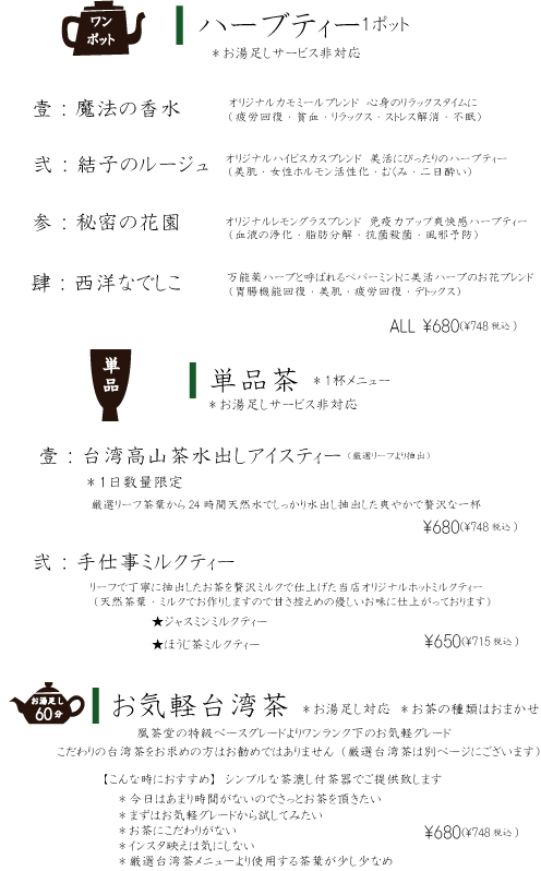 お茶専用サロンとなりますためお一人様お茶のワンオーダーを頂戴致しております